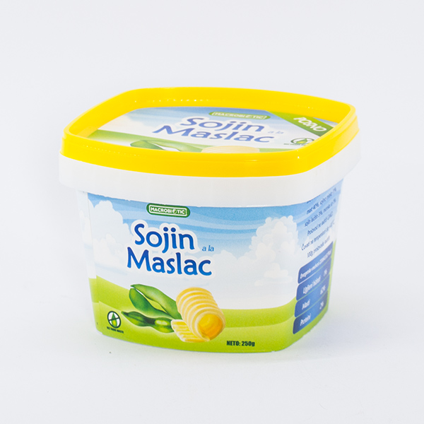 Maslac od soje. Sastav: Sojino ulje, hidrogenizovana biljna mast, sojino mleko, sojin lecitin, morska so.