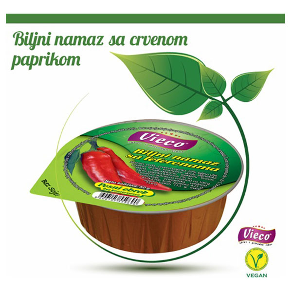 Biljni namaz sa feferonom Vieco je proizvod na bazi povrća, pravljen po vlastitoj recepturi. Ne sadrži soju, masti životinjskog porekla, šećer, gluten, veštačke boje, arome, konzervanse. Pogodan za post i vegetarijance. Sadrži još vodu, crvenu papriku, biljna ulja, proteine graška, krompirov skrob, dijetetska vlakna, so, inaktivni kvasac, papriku feferonu, začine.