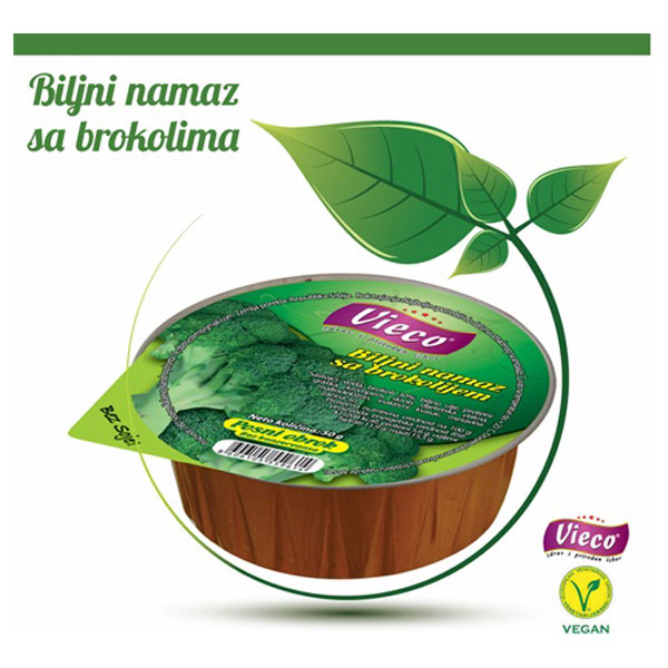 Biljni namaz sa brokolijem Vieco je proizvod na bazi povrća, pravljen po vlastitoj recepturi. Ne sadrži soju, masti životinjskog porekla, šećer, gluten, veštačke boje, arome, konzervanse. Pogodan za post i vegetarijance. Sadrži još i vodu, svež brokoli, biljna ulja, proteine graška, krompirov skrob, dijetetska vlakna, so, inaktivni kvasac, začini.