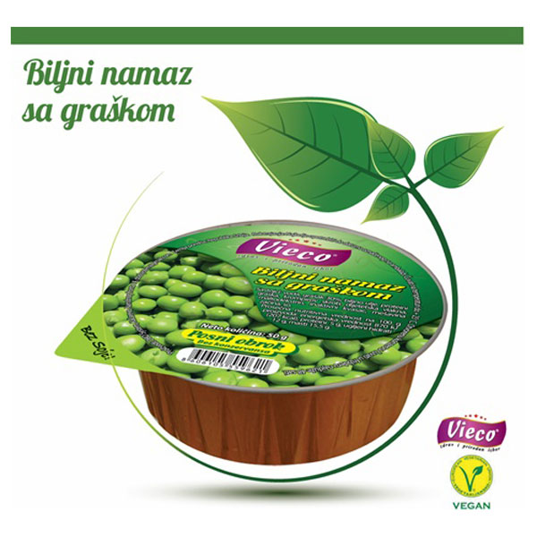 Biljni namaz sa graškom Vieco je proizvod na bazi povrća, pravljeni po vlastitoj recepturi. Ne sadrži soju, masti životinjskog porekla, šećer, gluten, veštačke boje, arome, konzervanse.
