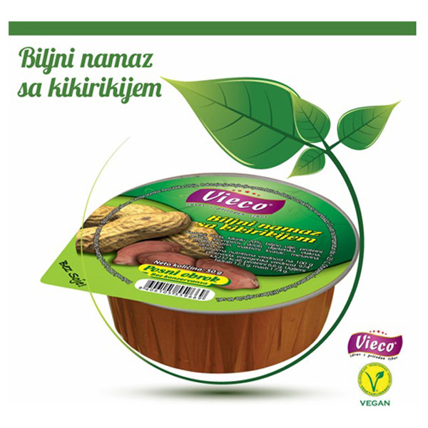 Biljni namaz sa kikirikijem Vieco je proizvod na bazi povrća, pravljeni po vlastitoj recepturi. Ne sadrži soju, masti životinjskog porekla, šećer, gluten, veštačke boje, arome, konzervanse. Pogodan za post i vegetarijance.