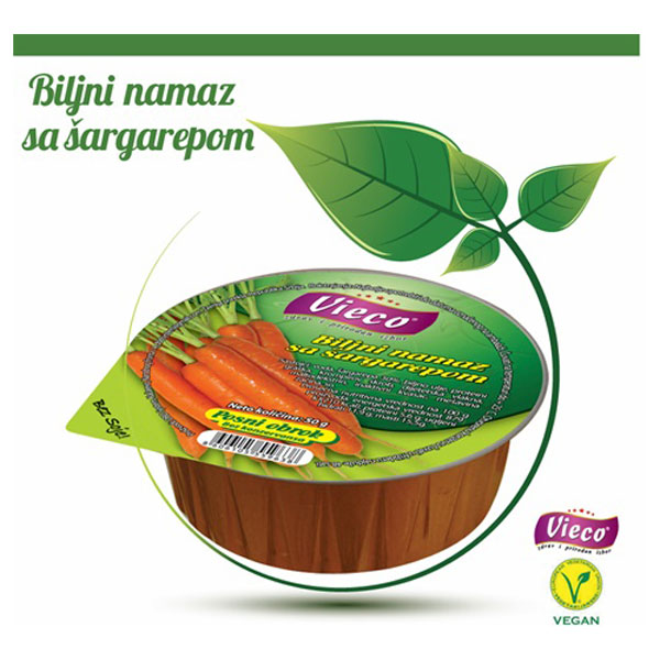 Biljni namaz sa šargarepom Vieco je proizvod na bazi povrća, pravljen po vlastitoj recepturi. Ne sadrže soju, masti životinjskog porekla, šećer, gluten, veštačke boje, arome, konzervanse. Pogodan za post i vegetarijance.