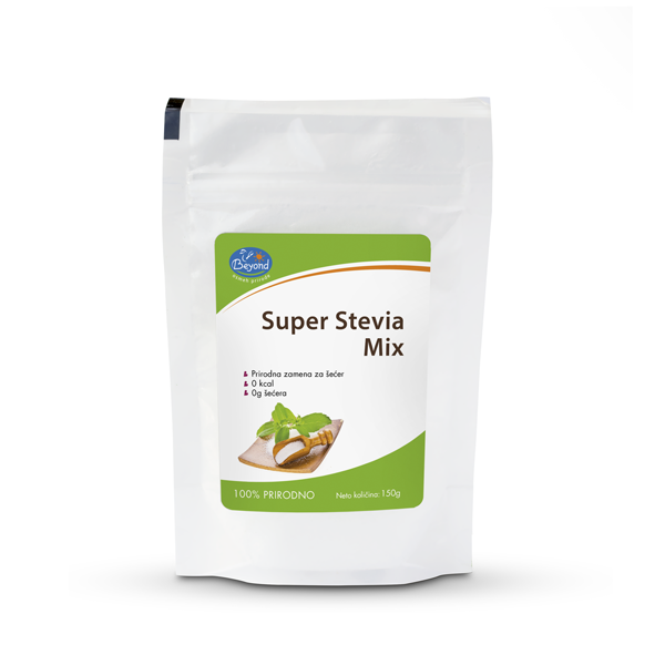 Super stevia mix je jedinstvena kombinacija prirodnih zaslađivača ekstrakta lista stevie RA 98% i eritritola, bez gorkog ukusa koji ostavlja samo stevia. Savršena je zamena za beli šećer jer ima 0 kcal, 0g ugljenih hidrata i 0g šećera. Koristi se u odnosu na beli šećer 1:1. 1g Super stevia mixa zamenjuje 1g šećera.
