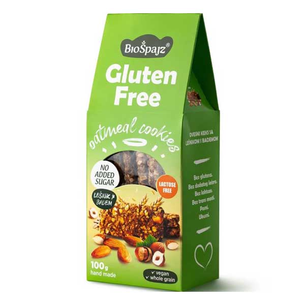 Ukusni integralni ovseni keks sa lešnikom i bademom, pogodan za osobe alergične na gluten, kontrolisan Elisa testom. Posan proizvod, ne sadrži trans masti ni laktozu.